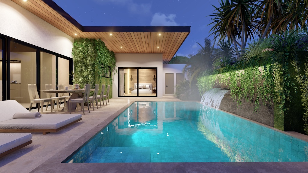 The private 6.5m x 4m swimming pools feature waterfall elements and integrated lighting, creating an atmospheric centerpiece for outdoor entertainment. Western-standard kitchens come fully equipped with premium appliances, while air conditioning and ceiling fans throughout ensure optimal comfort. The turnkey delivery includes complete furnishing packages designed for intensive holiday rental operations, making these properties immediately income-generating upon completion.